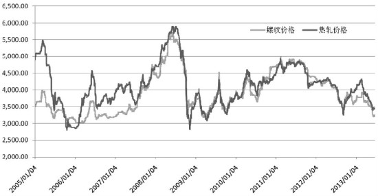 本文选取2005年至2013年1月的螺纹钢与热轧现货日价格进行分析。螺纹钢价格为上海地区20mm三级螺纹钢报价,热轧采用上海地区4.75热轧板卷报价。