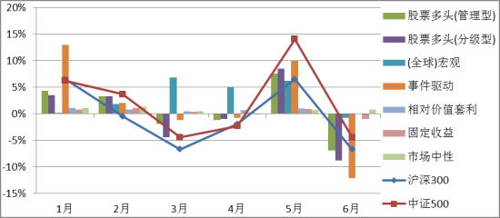 图表5:1~6月各策略私募基金与同期指数涨跌幅对比 |