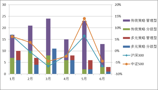 今年以来A股走势以春节为分水岭,市场情绪随之先扬后抑,投资者信心并未恢复,传统策略私募基金的发行仅仅比去年同期有所好转,其他策略尤其是中低风险策略私募则稳步发展。截至6月30日,上半年传统股票多头策略私募共计发行113只,较去年同期(80只)有一定回升,但相比前几年依然难以企及;其他策略产品今年以来发行数量为45只,多以分级型为主。图表8显示,发行市场在1季度、5月份在指数反弹带动下升温,随指数下跌而遇冷(产品数量均采取国金严格统计口径)。