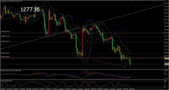 上图是黄金的小时图。图中我们需要关注的最重要的东西就是,黄金小时图下跌已经底背离,说明破位1283之后黄金的下跌意愿在短线已经降低很多。那么我们需要注意黄金可能出现的强势反弹。而强势反弹则需要关注重要的支撑位,1267或者1264则是其中最为重要的点位。