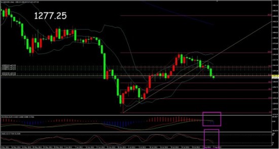 上图是黄金的4小时图。黄金4小时图中可以看到我在K线上标注了一个重要的支撑点,1264附近,它是黄金自最低点1180至最高点1347的50%斐波那契回调线。同时,1267这个点位是前期4小时W底部的颈线,而且我们看到,在前期突破1267这个点位的时候是放量击穿,而回踩1267则是迅速拉起,那么说明1267这个点位是一个重要的点位,那么无论黄金后市是重新转入跌势,还是仅仅作为一个中等级别的回调,1267这个点位附近都会受到支撑,短线企稳或者反弹的。同时我们还得注意的就是4小时趋势指标MACD,MACD金叉之后转为死叉,没有发生有效放量,这一点我们需要考虑,说明它依然具有下行动能。