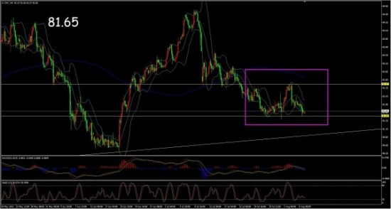 上图是美指的4小时图。图中显示美指昨日受阻于81.5支撑,也是前期的部分低点。那么这个点位相对而言比较重要。美指企稳于该点位的概率较大。如果美指跌破前低,那么下一个支撑位为81整数关口,则它将对黄金产生支撑。而根据近期行情走势来看,美指如果跌,对于黄金的支撑作用不会特别明显,但是一旦美指涨或者停歇,将会给黄金较大压力。