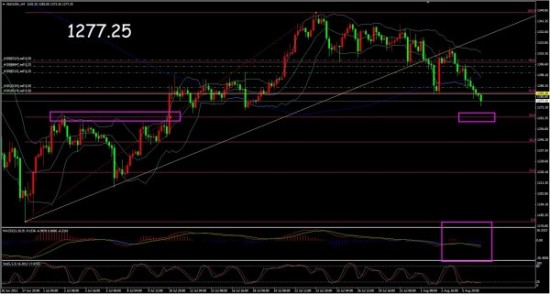 上图是黄金的日线图。我们需要注意,日线黄金开口以来,昨日有一个较大的跌势,但是并不是特别大。而指标上,日线黄金的stochastic指标已经超卖,但是由于黄金在短期日线上面走的是一个单边跌势,我们则需要注意,这个时候应该优先参考MACD趋势指标。MACD指标已经死叉,而且死叉之后快线依然运行在零轴上方,我们需要等待日线快线穿越零轴。同时我们注意到,震荡指标不是没有一点作用的,至少在短期上面,日线震荡指标超卖说明动能不足,黄金即将受阻,但是我们无法判断这个受阻是见底还是短期受阻,则需要结合其他分析指标来判断。