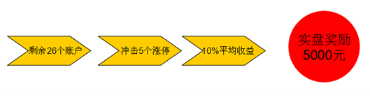 二、假如是不追求连赢的选手,那么也可以冲击较高的收益率以赢取实盘奖励,如果选手能在剩余26个账户中捕获5个涨停板,按10%的收益计,同样可以获得5000元的实盘奖励!这样计算,也仅仅需要不到20%成功概率。