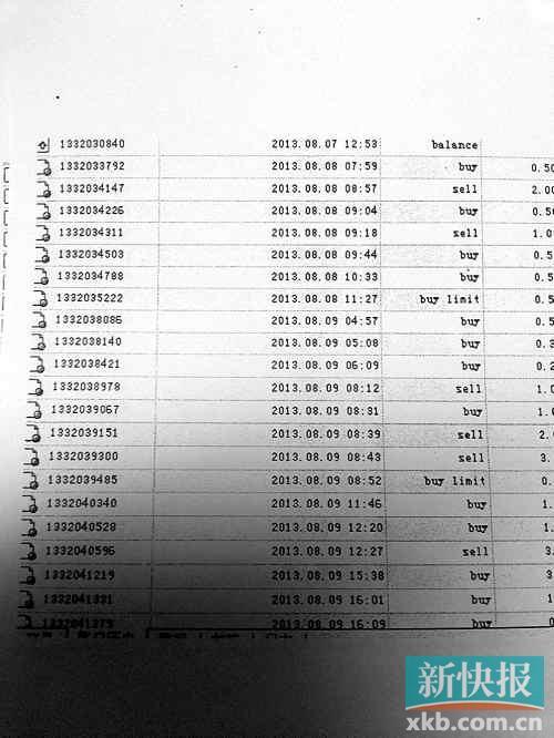 赵先生昨日向记者出示了一份交易清单,清单显示,8月9日,“女网友”从4时57分至18时46分共进行了22次大手笔操作,包括交易手续费在内,赵先生的账户亏损了3897.5美元。赵先生说,当天他下班回家看到这个金额,非常着急,立即通过QQ告诉“女网友”不要再进行大手笔操作。
