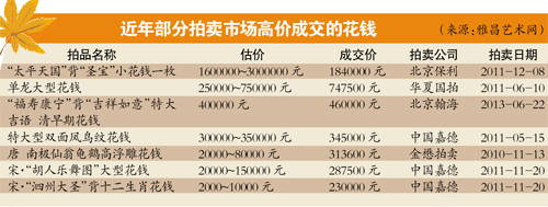 广东省集藏投资协会古银币专委会主任池仁坪告诉记者,古钱币的价格通常由市场的流通情况、收藏者的追捧情况来决定,而其本身的品相也是重要因素。“在清三代中,乾隆的花钱相对较多,而乾隆、康熙的通宝在市场上都很好卖,原因是大多数个头比较大,而且工艺佳、品相好。而20世纪初的花钱工艺相对差点,市场价格也略低。”他还表示,不少收藏者因为觉得花钱意头很不错,多拿来作为礼品,令花钱的价格上涨。