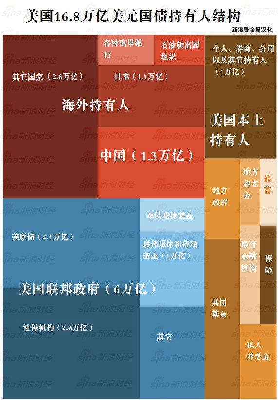换言之,下图解释了美国人都在欠谁的钱,新浪贵金属对图片和文章进行了汉化: