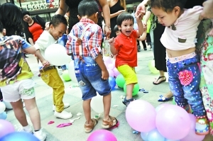 广告小明星Alex(中)在玩踩气球游戏。生活在广州的混血儿会说中文,爱吃海鲜和云吞面,年纪小小已经是广告明星,有人不到两岁就拍过上百个广告。昨日,多个生活在广州的混血儿家庭组织了一场别开生面的聚会,他们的妈妈在QQ上建群,目前会员已达100多人。