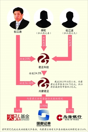 阿里巴巴入主天弘基金事件中,阿里巴巴和天弘基金管理层的入股成为了两大焦点,事件另一主角上市公司内蒙君正却并没有受到太多关注。证券时报记者调查后发现,在这一并购事件中天弘基金二股东内蒙君正才是主导方之一,而内蒙君正的大股东杜江涛也因天弘基金与阿里巴巴的合作,一举成为内蒙古自治区的新首富,杜江涛夫妻的最新持股市值达到了94.5亿元。