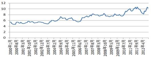 近年来,我国鸡蛋价格走势总体呈现上升趋势。2000年至2003年6月,鸡蛋价格相对平稳,总体在5元/千克之间波动。2003年6月之后步入震荡上行走势,2011年6月,全国鸡蛋平均价格突破10元/千克,较2003年6月上涨一倍。2011年11月鸡蛋价格自高位下滑,2012年5月全国鸡蛋平均价格下跌至8.23元/千克,而后价格开始回升,2012年10月全国鸡蛋平均价格为10.35元/千克。