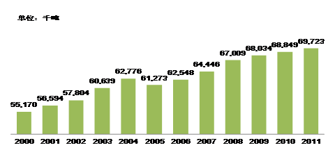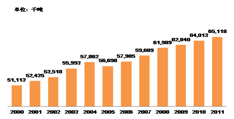 图2.2:全球鸡蛋产量变化趋势,2000-2011