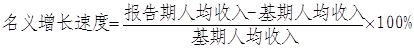 名义增长速度。主要反映居民持有货币收入的增减变化情况。计算方法是用报告期居民人均收入减去基期居民人均收入再除以基期居民人均收入。计算公式为: