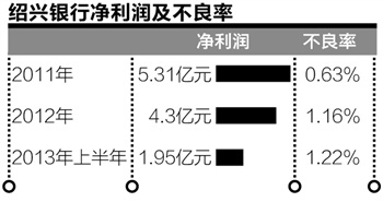记者发现,在2013年上半年,绍兴银行的净利润同比下降了41.86%,另外不良贷款率也反弹至1.22%。