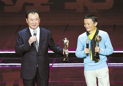 去年12月12日,万达集团董事长王健林、阿里巴巴董事局主席马云在CCTV中国经济年度人物评选颁奖现场。田贺 摄