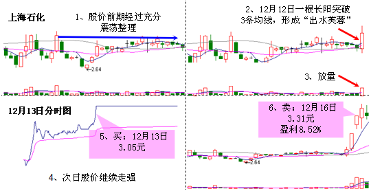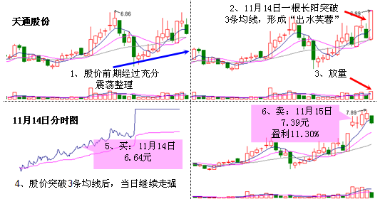 2、股价要一举突破3条短期均线;