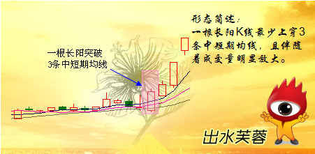 南朝·梁·钟嵘《诗品》卷中:“谢诗如芙蓉出水,颜如错彩镂金。”芙蓉:荷花,刚开放的荷花。比喻诗文清新不俗,也形容天然艳丽的女子。在股市中,“出水芙蓉”通常指一根大的阳线上穿三条均线,改变均线为多头排列,后势看涨。