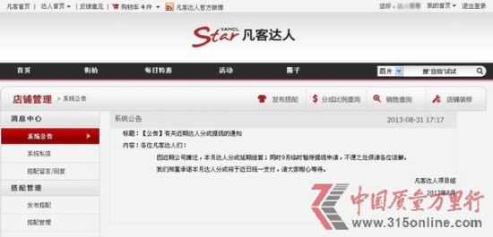 2013年9月初,刘先生像往常一样登陆凡客诚品账号准备提现,却发现提现页面出现了凡客诚品8月31日发布的官方公告:“因近期公司搬迁,本月达人分成延期结算,同时九月临时暂停提现申请。”这意味着,刘先生的提现9月暂停,要等到10月。