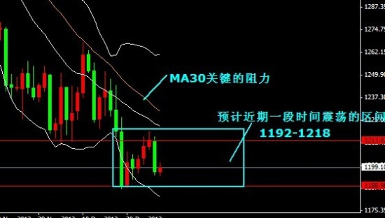 【黄金的分析】:黄金上周五开始连续的再回落,给国际金价反弹带来了下方再次抄底的机会,而面对近期无重磅消息面情况下,行情震荡上行,然后转而下跌,大多数的朋友都是比较迷糊的,而对于这样的一个情况,本人给出的答案是:市场对于圣诞节和元旦2大节日,交易比较清淡,而随便一个大一点的买单都会引起大的波动,但是这样的波动不会产生关键点破位和方向性的改变,也就是在遇到关键的支撑阻力情况下,行情会出现反方向的走势,比如1192-1195一线的关键支撑,价格在触及这一线底部支撑的时候开始出现多头买盘介入反弹的情况。而下一个重磅消息是出现在下周的非农,对于非农的预测,下周再给出了,在技术盘面上,近期的走势,到目前位置可以看成是震荡,目前日线上看,k线都是围绕1192-1230之间在走,目前整体上也就是这个震荡区间,后市如果有效破位这个区间,顺势发展,就不成问题了,而对于下破,笔者没有兴趣去做单,因为点位太低,随时有买盘介入引起反弹,而对于上破,那么追多的人肯定比较多,所以可以顺势追一把,短周期内,上方阻力在1220附近,如果破位这里,日线也会形成W底格局,所以目前来看,短周期内操作思路保持1192-1220之间即可,而短周期4小时,昨日的回调以及日内的反弹形成暂时止跌的信号,目前来看,下方1194-1196支撑比较强,而上方1206-08一线是boll中轨所在,短周期内形成阻力,这就需要我们关注1196-1206之间的区间整理情况了,日内维持这个区间内高估低渣,破位后看区间1192-1220。