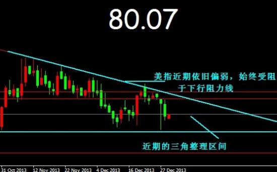 【美指的分析】:美元的走势依旧颓废,近期还是偏弱,日线图上看,近期再次试探了下方关键支撑79.65附近,而且正如本人预计,美元近期会维持在80.65-79.65之间来回震荡,直到破位,而且这样弱势的震荡中,向下破位的概率更高,短周期内没有重大消息面,只能等1月份的非农才能打破这个区间震荡,弱势不可改变,月末期间关键依旧看80.65-79.65之间,破位区间后选择方向。