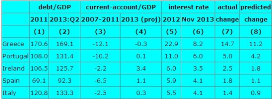 下表总结了自2012年以来,上述欧元区5国债务,经常账户盈余,以及政府债务利率变化。如果债务/GDP比率如第(3)列所显示的变化,经常帐/GDP比率变化如(4)所显示的变化,同时假设利率维持在(6)的水平,那么最后一列(8)将代表未来这些国家10年期主权债收益率。
