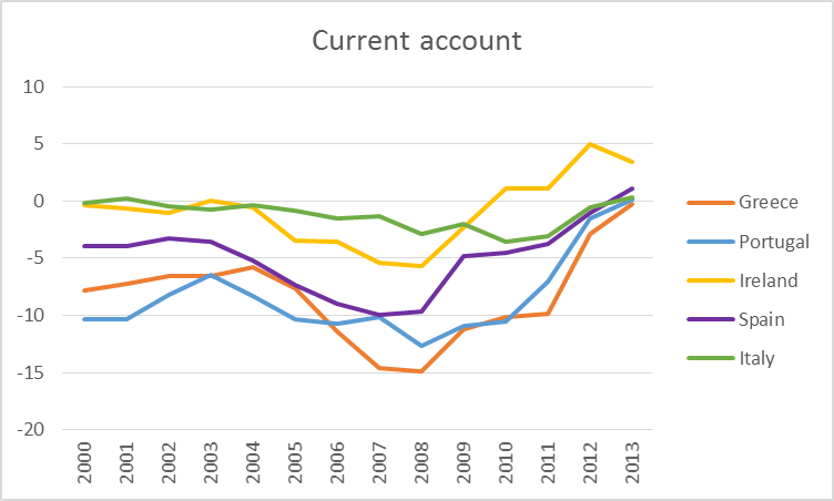 从另一方面看,这些欧元区边缘国家的经常账平衡正显著改善:从此前的大幅赤字,正转为小幅盈余。经常账户改善同时意味着这些国家的海外借款减少,同时国际信贷市场融资状况出现改善。但不幸的是,这个转变似乎并不是源于货币贬值,或是为提高竞争力进行的价格和工资调整,而是由于这些国家经济衰退导致的总支出下降(无论是对国内产品还是国外产品)。