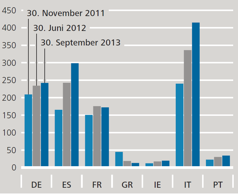卫报》的一份报告显示,自2011年11月到2013年9月以来,西班牙金融机构增持了1340亿欧元政府债券。这意味着西班牙银行业增持了81%的政府债务,在此期间购买了65%的新发政府债券。