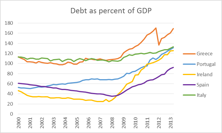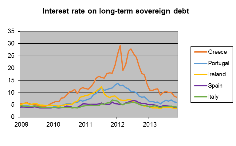 在2012年3月PSI私人部门折让后,希腊主权债务收益率急速下降,这个事实上的违约让希腊债务价值损失了20%。但是由于财政赤字居高不下,希腊GDP仍然处在收缩期,希腊目前的债务占GDP比率仍然处于2011年年底的水平。与此同时,葡萄牙、爱尔兰、意大利和西班牙的债务率还在不断攀升。