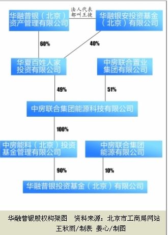华融普银的大股东为中房能科(北京)投资基金管理有限公司,这是一家由中房联合集团能源科技有限公司100%出资建立的公司;中房联合集团能源科技的股东又有两个:中房联合置业集团有限公司持股51%,华夏百姓人家投资有限公司持股49%,而华融普银又正好是后者的股东。