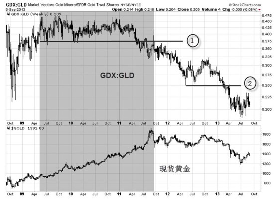 所以我们从图图3-20中的阴影部分也可以看到,自2009年以来,GDX与GLD的比值一直在往下走没有创新高,而金价则迭创新高,这说明什么呢?说明现货买盘越来越少,而手上有现货的公司也一直在趁机逢高出货。当金价创下1920美元高点的时候,GDX与GLD的比值却跌破了前期低点(图3-20中标示1的虚线处),而当2013年4月12日的大跌开始前,两者的比值也早就跌破了虚线2的位置。所以我们看到当2010至2011年金价快速上涨这段时间,两者的比值却处于横盘的状态,显示金矿个股并未被特别追捧,显然金矿上市公司的经营状况及财务报表并不突出。而当金价一旦下跌,金矿公司的收入锐减,从而股票遭到投资者的抛售,体现为两者的比值大幅下挫。所以某种意义上而言,也许金矿企业股票并不是很好的投资对象,因为他们不能掌握自己产品的价格。也就是说,生产投资和其他企业没有什么区别,但是产品售价却要听从别人定价,基本算是靠天吃饭。只有当市场预期金价后市会走强时才会追捧矿商股票,比值会有小幅上涨。而一旦比值突破盘整区间下跌则有可能是因为电子盘上涨过快,投资者此时可以持有电子盘的多单一段时间,但要预防后市可能的抛售。所以GDX与GLD的比值与金价的关系可以作为市场的领先指标,值得交易员们细细体味。