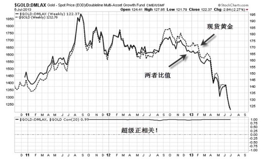 图3-19显示的很明显,当金价上涨的时候,基金的表现要好于黄金。而当金价下跌的时候,例如现在这个时期,基金的表现则明显偏弱,黄金相反则显得比较抗跌。这个基金的表现以及与黄金的比值,我们拿来作为一个参照,就可以从另一个角度观察到黄金的走势究竟怎么样,如果是比较好的话,那么这个比值也应该往上走,如果金价走得比较弱的话,这个比值也走得比较纠结。当然,如果仅仅观察DMLAX的表现也可以,但笔者认为以比值的方式来观察可能会更清晰一点。