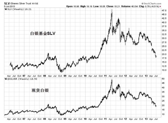 (图3-15,白银基金SLV与现货白银周线图)