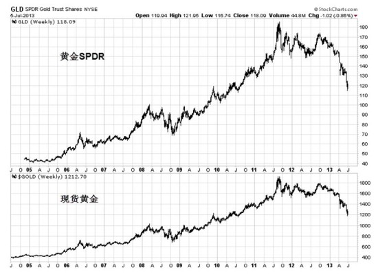 (图3-14,黄金SPDR与现货黄金周线图)