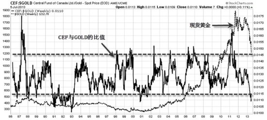 (图3-16,加拿大中央基金CEF与现货黄金月线图)