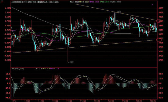 上交易日现货白银收盘价为3905,最高价为3982,最低价为3872,跌幅为-1.09%,收盘K线为上下影线较长的阴线。白银周线收阴黄金周线收阳,金银出现背离,依照以往的经验,出现这种情况意味着金银走到了阶段性的高点,但是具体走势还要看本周四凌晨的联储利率决议。