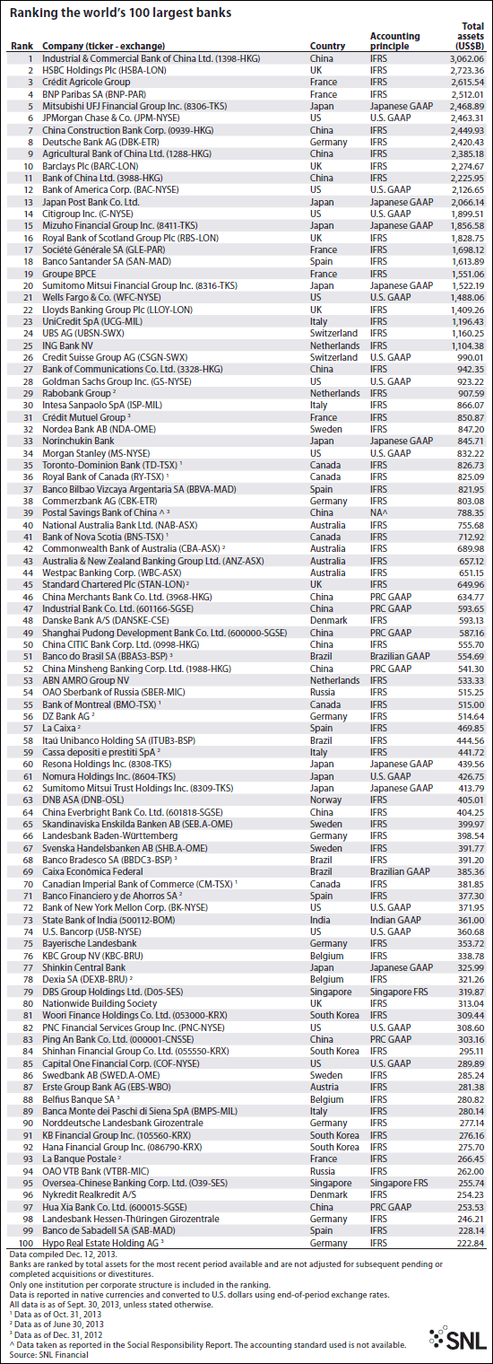 注意到该榜单前列中没有哪些银行吗?是的。美国没有一家银行进入该榜单前五名。事实上,美国最大的银行仅仅排名世界第六。该银行是摩根大通(JPMorgan Chase),截至2013年9月份的总资产为2.463万亿美元。