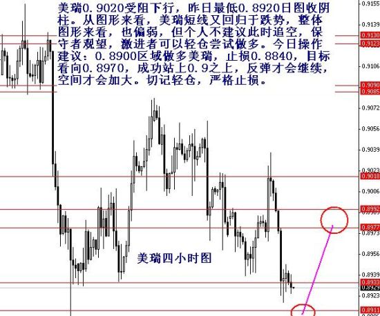 美瑞0.9020受阻下行,昨日最低0.8920日图收阴柱。从图形来看,美瑞短线又回归于跌势,整体图形来看,也偏弱,但个人不建议此时追空,保守者观望,激进者可以轻仓尝试做多。今日操作建议:0.8900区域做多美瑞,止损0.8840,目标看向0.8970,成功站上0.9之上,反弹才会继续,空间才会加大。切记轻仓,严格止损。