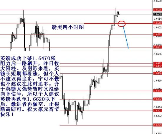 英镑成功上破1.6470强阻力后一路飙升,昨日收大阳柱。从图形来看,英镑长短期都看涨,但个人不建议再追多,宁可不做也不建议在此时追多。介于英镑太强势暂时又没给向下信号,所以个人建议英镑再跌至1.6620以下后,激进者再做空,止损新高即可。祝大家元宵节快乐!