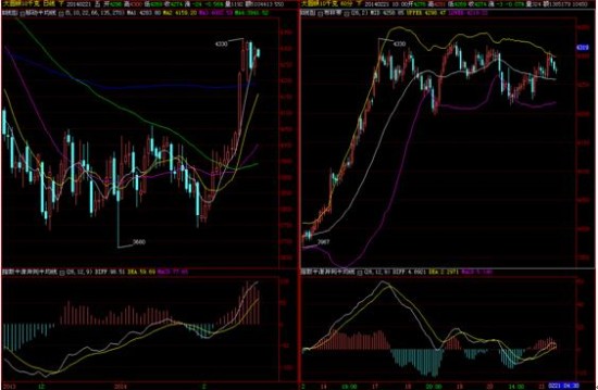 周四(2月20日)亚欧盘交易时段,由于受美联储会议纪要再度强调缩减QE预期影响,现货金银呈现震荡下行走势,美盘时段,伴随着初/续请失业金数据的持续报差,使得美元指数再度承压,金银反弹,纽约尾盘时段,黄金白银进一步走高,黄金一度刷新近两个交易日高点至1324.9美元/盎司,大圆银则刷新日内高点至4308元/千克,并纷纷收取上下影线均较短的中阳。