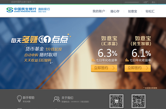 “如意宝”是民生直销银行主推的类余额宝理财产品。此次,一共推出推出了两款,一款产品挂钩汇添富基金货币基金,预期年化收益率6.3%;另一款产品挂钩民生加银的货币基金,预期年化收益率6.1%。