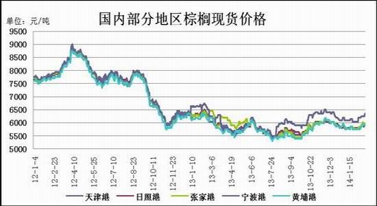 期市看,2月份BMD棕榈油指标5月合约强势反弹,截至2月26日收盘,指标5合约月K线上涨幅度在9.94%左右,收盘价为2810令吉/吨。而国内棕榈油期货由于库存回升,表现弱于马盘,整体呈现弱势反弹的走势。截止2月26日收盘,棕榈油1405合约月K线收盘价为6240元/吨,月上涨幅度为8.3%左右。