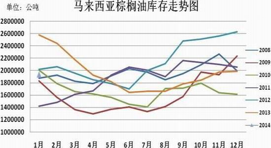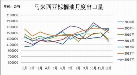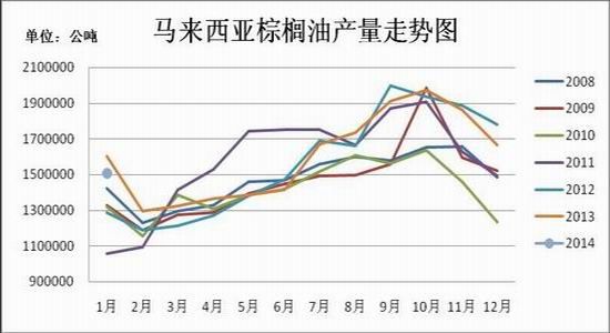 一般来说,1-2月份棕榈油处于生产淡季,3月份产量开始回升,直至9-10月份达到最大值。根据2008-2013年马来西亚棕榈油产量走势来看,除了2011年2月份棕榈油产量小幅回升,其他年份2月产量均下滑,因此2月份产量继续下降的可能性较大。另外,2月下旬有消息称马来西亚和印尼部分地区遭遇干旱气候,这给棕榈树种植带来一定压力,影响到棕榈果的生长,可能导致本月减产幅度大于预期。出口方面,虽然2月份仍处在棕榈油的消费淡季之中,但是随着气温上升,棕榈油消费需求也有所回暖,船运调查机构ITS数据显示,马来西亚2月1-25日棕榈油出口量较上月同期增加1.57%至104.8311万吨,其中印度与中东进口需求增长,中国与欧盟需求下降。在产量减幅扩大与出口需求回暖的预期下,2月马来西亚棕榈油库存可能继续下滑,有市场人士预估库存将下滑至183万吨,这对棕榈油价格构成支撑作用。