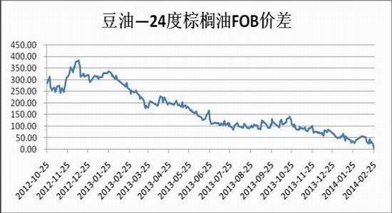 2月马来西亚棕榈油出口需求预期与1月份出口量接近,增减幅度相对较小,后市随着温度升高,棕榈油消费需求持续回暖,主产国棕榈油出口需求随即受到提振。从2008-2013年马来西亚棕榈油出口量来看,3月马来西亚棕榈油出口量较2月份增长的概率较大。不过2月份马来西亚棕榈油期货价格大幅上涨,而豆油受南美丰产影响涨势弱于棕榈油,导致国际豆油及24棕榈油FOB价差持续下降,2月下旬已下跌至历史低位,这不利于后市棕榈油出口竞争力,将减弱气温回升对棕榈油出口需求的带动作用。