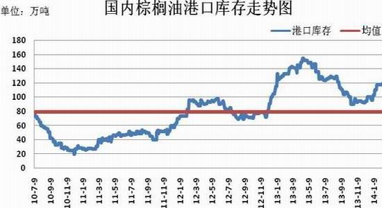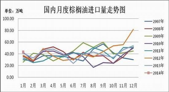 我国棕榈油完全依赖进口,从2009-2013年棕榈油进口分量来看,第一季的进口量明显低于第四季度,第一季度正常波动范围为25-50万吨。2014年1月份中国的棕榈油进口量为556,523吨,比上年同期提高17.76%,商务部预报2月份棕榈油进口量为21.9185万吨。由于棕榈油贸易融资受2013年5月发布的《关于加强外汇资金流入管理有关问题的通知》影响,棕榈油进口量方面受到一定的限制,第一季度进口量维持在正常偏高水平的可能性较大,预期3月份棕榈油到港量缓和性增长,可能在40-48万吨之间。