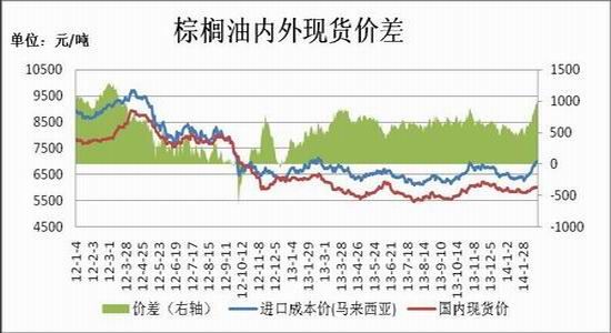 2月份期间,马来西亚棕榈油库存下滑,且2月上中旬出口数据利好,棕榈油期货价格振荡上行,豆油及菜油在棕榈油及外盘行情的带动下偏强运行,棕榈油领涨于油脂。因此国内豆棕现货价差从2月初的917元/吨缩窄至810元/吨,1409月合约价差从700元/吨回落至600元/吨,无论现货价格差还是期货价差都处于相对低位。目前来看,棕榈油基本面好于豆油,豆棕价差可能还会收窄,但是豆棕期货价差临近历史低位,后市收窄空间有限。3月中下旬预期有南美大豆到港,届时豆油供应压力再增,可能拖累油脂回落。