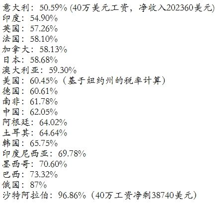 比如英国,最高税率45%的起征点是250000美元(151000英镑),在意大利(最高税率43%)的起征点是125000美元。