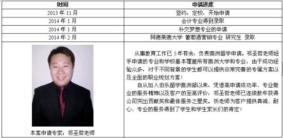 在G同学找到伯乐留学后,澳洲申请专家根据她的个人情况,为她推荐了适合的国家,伯乐留学澳洲部齐老师在与G同学沟通中,除了帮她解脱DIY失利的困扰,同时,帮助她定位留学和职业发展方向针对G同学的情况为她做留学申请规划,最终根据G同学的兴趣爱好和所学专业,帮助她锁定了澳洲的阿德雷德大学酿酒和墨尔本大学会计专业。如果这个案例仅说到这,就是一个普通的不能在普通的案例,无任何新奇。可奇迹往往就是在一瞬间改变了一个人对命运的选择!澳洲八大之一的阿德莱德大学的葡萄酒营销专业需要两年工作经验的要求突然取消了,转而代之的是需要学生准备两封推荐信并接受学校的面试。这就代表G同学可以申请澳洲八大名校之一阿德莱德大学葡萄酒营销专业,同时还为G同学加申到了葡萄酒酿造专业,虽然G同学的平均分与阿德莱德大学的入学要求还有2分的差距,伯乐留学澳洲申请专家结合G同学的职业发展要求和兴趣,在加申专业的同时,为她重新定制了2套申请方案,以及在她的PS上结合她的个人兴趣和爱好,使得申请事半功倍。在四个星期后G同学如愿以偿的收到了阿德雷得大学的offer,而且让人惊喜的是,阿德莱德大学竟然免除了G同学的入学面试,只要她的雅思成绩能达到要求就可以顺利入学了!