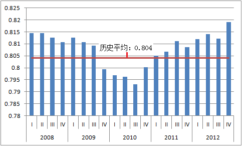 二是2012年第四季度整体GDP增长率为0.1%。但全部私有部门GDP增长了1.5%,而核心GDP增长了3%,并且核心GDP/整体GDP达到了经济衰退以来甚至是历史最高位81.9%。