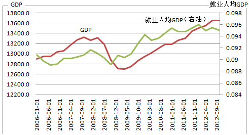 图5 美国的GDP总量和就业人均GDP(单位:10亿美元)