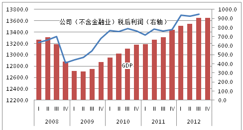图7 美国公司(不含金融业)税后利润与GDP增长(单位:10亿美元)
