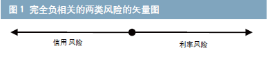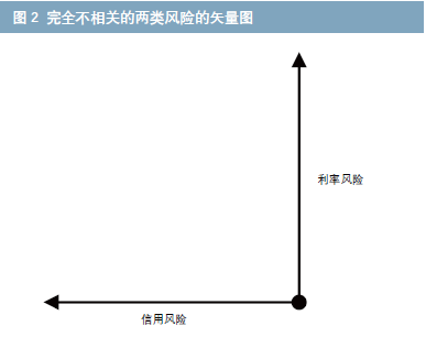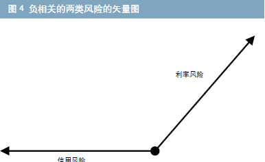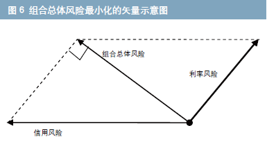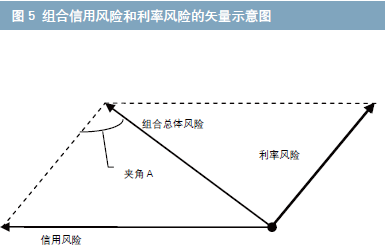 图5中3个矢量(实线箭头)分别代表信用风险、利率风险和组合总体风险,两条虚线为信用风险和利率风险两个矢量的平移。组合总体风险代表着信用风险和利率风险结合后的整体风险状况(暂不考虑其他类型风险),其长度代表了投资组合整体的风险大小,方向则代表投资组合的总体风险是偏利率风险还是偏信用风险。